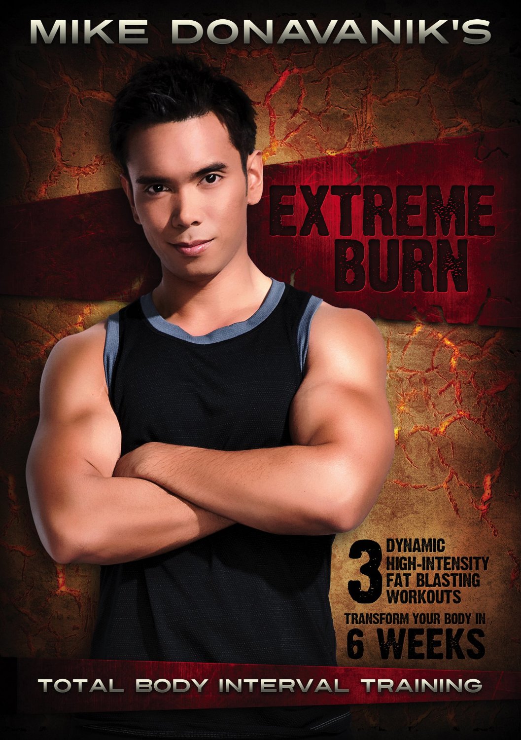 First off, Extreme Burn contains two advanced metabolic strength training workouts. They are composed of compound strength exercises, some cardio and core work. This workout moves very fast. I worked up quite a sweat and my muscles were hurting several times. In theory, that is a good thing for this type of workout, but in reality it was sometimes a problem. Some of the compound strength moves are so “compounded” they are awkward. I could not do them at Mike’s pace while using a heavy enough weight to give my muscles sufficient strength work and maintain good form. However, even the exercises I had to take at a slower pace still burned me out. So that is a good thing. But there is another “however”—even if going at a slower pace didn’t detract from the benefit I got from the workouts, what did detract was the awkwardness of some of these compound moves. In particular, in workout #1, there is this crazy combo: start in plank, do renegade row but hold dumbbell at top (so you are now supporting body in plank with one hand), jump legs in, stand and do one arm overhead press, keep dumbbell at top of move (overhead) while doing a wide squat and touching the ground with opposite hand—then squat thrust back into plank and keep repeating. That “modified” windmill was so awkward for me. Apparently it can be done properly because Mike and his crew had awesome form, but I could not get my body into the same alignment as them—tho I tried every single time! None of the other exercises gave me this much of a problem, but there were several that I could not do at the warp speed that Mike and crew did them. Now, once I accepted that, I did like the workouts more. Also, according to Mike, Workout #2 is more advanced than Workout #1—but I didn’t really see that. They are both equally advanced, I thought. I actually found some of the compound strength moves in Workout #1 more difficult than the ones in Workout #2.