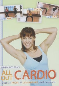 All Out Cardio is from Mindy Mylrea and it was definitely a major impulse buy. Mindy had a sale on her website–one day only. All of her workout DVDs were $3.99. How could I pass that up? So I didn’t. I bought 9. So there will be a lot more Mindy reviews to come. All Out Cardio seemed like a great collection. Mindy puts together 6 different cardio segments that you can mix and match anyway you want to make your workout as long as you need it to be. The main page has each segment listed individually so you can click on them and mix and match anyway you want. She also has premixes. Because there is so much to try on this DVD, I tackled this DVD by premix. I used these as my doubles workouts (second workout of the day after I get home from work) so each workout I do needs to be about 30 minutes long. I did the first 3 premixes that mixed one of the cardio segments with its associated interval–and has the stretch at the end. Between those 3 premixes you do everything that is on this DVD. The other premixes just mix and match those same segments in different ways. And the final, longest premix (83 minutes), plays everything. All of the premixes, what they contain and their time/length are all listed at the bottom of this review.