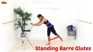 Standing Barre Glutes is 28 minutes long; w/ 1 minute stretch. Equipment needed: chair and a resistance loop.