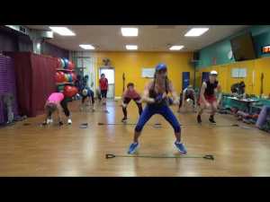 - T jumps over the band–when you jump over it, you land in a squat and hold for 3 counts; ends by holding the squat and pulsing for s slow 8 count