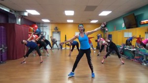 Kickboxing/High Calorie Cardio Blast is 70:30 minutes long; 9 minute warm up and 2 minute stretch. The bulk of the workout is cardio kickboxing consisting of kick drills, punch drills, cardio drills and some plank based moves. For the first 54 minutes, all you need is weighted gloves. I used my 2 pound gloves. At 54 minutes Yvette and class get their mats, sliding disks, a resistance loop (firewalker) and light dumbbells (5 pounds). FYI–the sliding disks are never used, so you really don’t need them. It takes about 1:30 minutes to get everything set up. Yvette places the loop around her ankles and here is what follows for the final 15 minutes of class: