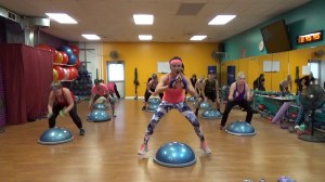 - Bosu still upside down, with hands on edges of bosu, burpee w/ plank jack, stand and jack while pushing bosu overhead