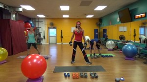 Bootcamp/Bodyweight HIIT workout is 69 minutes long; 8 minute warm up and 2 minute stretch. Equipment: stability ball and various dumbbells (Yvette uses 5, 8, 10, 15 and 20 pound dumbbells). She also wears weighted gloves (I did, too). You need a medicine ball at the end of the workout and you will be using the stability ball for the final exercise then you will also use it for the stretch. The first part of the workout (42 minutes) after the warm up is done for 40 seconds of work and 10 seconds of rest. At 54 minutes you do 20/10 intervals (starts at #56; 20 minutes of work and 10 seconds of recovery). At 61 minutes you do 3 partner abs exercises (each exercise is done for one minute) and the workout ends w/ ball wall squats. The weights listed below are what I used.