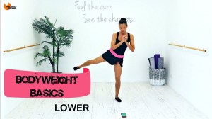 Bodyweight Basics Lower is 31 minutes long; 1 minute intro, no warm up and 3 minute stretch. No equipment is needed but a chair is useful for balance and if you have back problems when you bend over for long periods of time (while also working your legs) then you may need the chair seat or yoga blocks to relieve the pressure on your back. Each exercise is done for 70 seconds and you get a 10 second break.