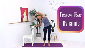 Fusion Flow: Dynamic is 25 minutes; 30 second intro, 3 minute warm up (warm up is #1) and 1 minute stretch. Equipment: chair.