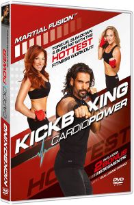 Kickboxing Cardio Power is another cardio kickboxing workout by Guillermo Gomez in his Martial Fusion series. Jessica Smith (his wife) is one of the background exercisers. The DVD includes 9:30 minutes of bonus drills and a short tutorial in which Guillermo uses the other background exerciser to demonstrate form.