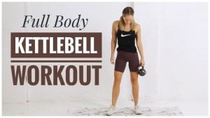 20 Minute Full Body Kettlebell Workout is 23 minutes; no warm up, 2:30 minute stretch. Heather is using a 15 pound kettlebell. I used several kettlebells ranging from 10-20 pounds. The weights listed below are what I used.