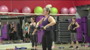 - Overhead tricep extensions (French press) (Cathe is using 12# DBs)