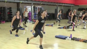 - Squat + front kick + squat + rear lunge, all while doing bicep curls (Cathe is using 5# DBs)