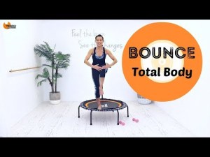 Bounce Series: Total Body is 55 minutes; no warm up and 4 minute stretch. Equipment: rebounder and light hand weights (Linda is using 1kg or 2 pound hand weights). You start the workout on the rebounder holding the light dumbbells.