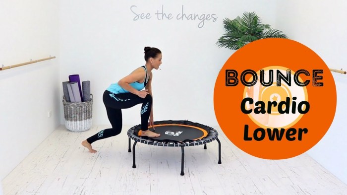 - Start standing on the rebounder and do alternating reverse lunges, stepping one foot off rebounder onto floor behind you and tapping fingertips to top of rebounder while in lunge; add 3 pulses to each lunge; changes to reverse lunge + knee raise + reverse lunge then change legs; remain in stationary lunge with back foot on floor, fingertips reaching toward top of rebounder and do 20 low end pulses