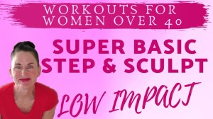 Low Impact Super Basic Step & Sculpt is cardio + strength low impact metabolic workout from AngieFitnessTV. Angie puts together 4 step combos and each combo is separated by a metabolic strength circuit. The first cardio step combo is made up of basic step moves such as stepping on and off the step, corner to corner knees, repeater knees and hamstring curls. You do this for about 9 minute then you grab some light hand weights (Angie recommends 3-5 pounds) and do 4 minutes of weighted step work. You put the weights aside and do another 9 minutes of step cardio. For the second combo you do more basic steps, V steps, turn steps and repeater knees. Once you run through this combo a few times she combines it with the first combo. You get a short water break then she has you grab 3-5 pound dumbbells again for 4 more minutes of metabolic strength work on the step. You set the hand weights aside for 8 more minutes of step cardio. The 3rd step combo includes: triple stomps with a step back, alternating corner knees, and triple repeater knees. Once again, Angie runs you through this new combo a few times then she combines it with combos 1 & 2 for a longer step combo. Grab light dumbbells again (really light ones this time) and do 3 more minutes of light weight work on the step. Set the hand weights aside for 7 more minutes of step cardio. The 4th combo is made up of moves such as corner to corner glute lifts and alternating step knee raises. After running through this combo several times, Angie strings all 4 combos together. The workout ends with 4 minutes of core work.