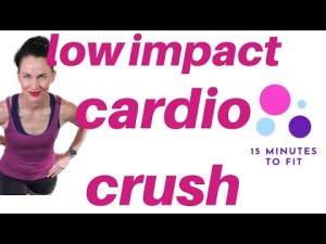 Low Impact Cardio Crush Intervals is 18:48 minutes; 35 minute intro, 3 minute warm up and 3 minute cool down/stretch. Equipment: step @ 8 inches set up vertically. Having done the workout, there is no reason to have it set up vertically if you are more comfortable with the step being horizontal–which I am. I ended up doing all of the moves facing the step horizontally. Angie has it set up that way because you are alternating step work with floor work and her workout space is kind of small. So she needed the room for the floor work. If you have a large space then set the step up however you want.