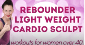 Rebounder Light Weight Cardio Sculpt is 63:28 minutes; 5 minute warm up, 6:30 minutes core and 5 minute stretch. Equipment: rebounder, ankle weights and light to medium dumbbells.