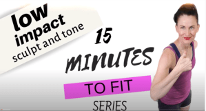 Low Impact Sculpt & Tone is 18:49 minutes; 45 second intro, 3 minute warm up and 2 minute stretch. Equipment: step bench with additional risers (Angie has 3 risers each side or 10 inches) set up vertically and medium weights (Angie is using 8 pound dumbbells).