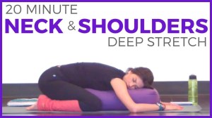 20 Minute Deep Stretch Yoga for Neck & Shoulders uses a bolster and a fitness mat. Optional for tight hamstrings: folded blanket.