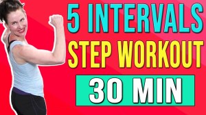 5 Interval Cardio Step + Strength is 30:55 minutes; 5 minute warm up (Interval 1 is the warm up) and no cool down/stretch. At the end Angie says she hopes to see you for the cool down/stretch then the workout ends. I searched her YouTube channel and there was no short stretch created around the time of this workout to add on to the end of this. In fact, her shortest stretch workouts are 15 minutes but none of them are associated with this workout in any way. Equipment: step at 6 inches and dumbbells. I had my step at 8 inches an also wore an 8 pound weighted vest. I used the same weight as Angie did for all of the exercises except the kettlebell swing.