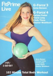 FitPrime Live contains two workouts. Both of these workouts were filmed live at a FitPrime “fitness vacation” (I think that’s what one of the instructors called it). I chose this collection because it is subtitled G-Force 3 and G-Force 4. FitPrime’s G-Force workouts are workouts that use a rebounder. G-Force 4 is done by 4 different trainers: Tracie Long, Carissa Foster, Cindy Thorp and Eleanor Washburn. G-Force 3 is led by Anna Benson, one of the creators/founders of The Firm who later broke away to create FitPrime. The two workouts are very different. So lets start with the one I liked.