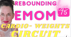 Rebounding EMOM Cardio-Weights Circuit is one of AngieFitnessTV’s live workouts. It is actually only 60 minutes long but looks much longer (84:10 minutes). The first 5 minutes is Angie talking while she is waiting for her viewer/exercisers to log on and the final 19 minutes is Angie talking with her viewers. Angie does give information you need for the workout during the first 2:30 minutes but if you read this review then you already have all of that info. Just scrub forward 5 minutes so you can keep your workout at 60 minutes. And the actual workout is exactly 60 minutes. Once Angie starts working out she does not waste any time.