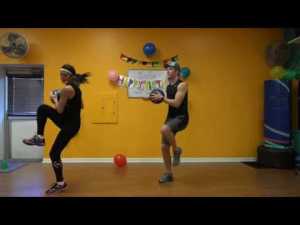 30 Minute Medicine Ball Birthday Blast is 35 minutes; 5 minute warm up and 1:30 minute stretch. Equipment: medicine ball. Yvette and her brother are using 6 pound medicine balls.