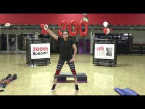 Metabolic 300 is 48:30 minutes; 1 minute intro, 2:30 minute warm up and 2:30 minute stretch. Equipment: full step at 10 inches (3 risers), various dumbbells and a fitness mat. I used the same weight as Cathe unless otherwise noted below.