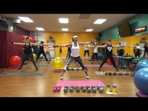 Low Impact Weights and Cardio is 60 minutes; 8 minute warm up and 3:30 minute stretch. Equipment: various dumbbells, stability ball and fitness mat. I do not know what weight Yvette used for all of the exercises. I only know she had a set of 25 pound dumbbells as her heaviest. Yvette was also wearing weighted gloves.