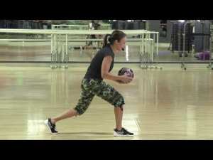 15. Crossback (curtsy) lunge while circling med ball from hip to overhead