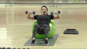 - Alternating chest flys on ball (Cathe is using 15# DBs; I used 13# DBs)