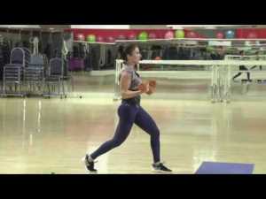 - Double arm front swing while doing a wide pile squat (DBs are held together when swinging), raise DBs overhead then open them into a goal post (Cathe is using 8# DBs; I used 10# DBs)