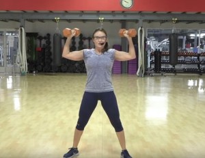 - Front swing into pull down (stand with legs wide, holding DBs together, swing them down between thighs as you squat then raise DBs overhead when you stand and open arms into goal post) (10# DBs)