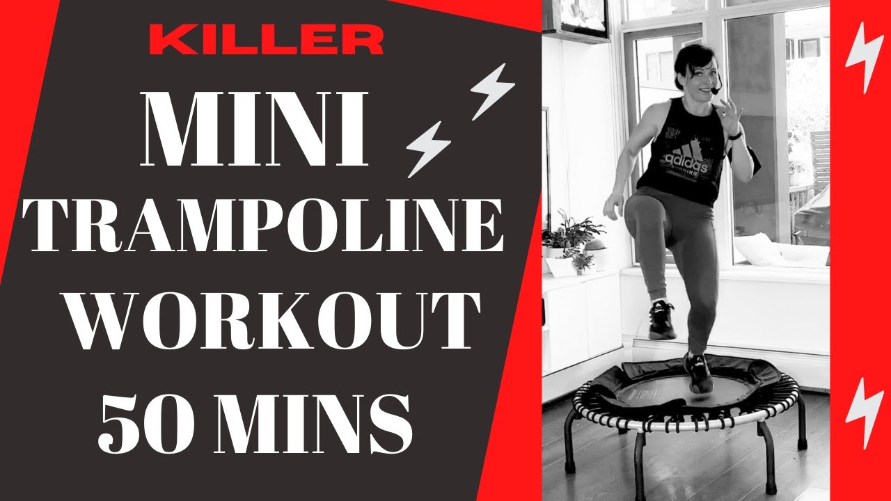 Rebounder Workout with Weights is 51:20 minutes; 1 minute intro, 2 minute warm up and 4:30 minute stretch. Equipment: rebounder, dumbbells and fitness mat. Naomi is using 5 pound dumbbells. I also used 5 pound dumbbells, but in the future, I will have my 3 pounds nearby for the alternating front punches–I was struggling using the 5 pounders. For the cardio segments you do a basic bounce between some of the moves.