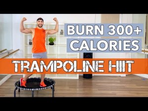 30 Minute HIIT Trampoline workout is 33:37 minutes; 3 minute warm up and 2 minute cool down/stretch. Equipment: rebounder and a mat or towel.
