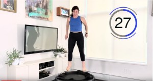Mini Trampoline Upper Body Sculpt is another tough and intense cardio + strength rebounder workout from Naomi Joy. I came to this workout sore from her excellent lower body workout that I did yesterday. The strength work in this workout is all upper body and it is a deceptive. Naomi uses nothing but a set of 8 pound dumbbells for the strength work but the exercises she does do not require heavy dumbbells when they are done at Naomi’s slow controlled pace. Plus she adds pulses to the high/working end of some of the moves that really start to fry the muscle group being worked by the end of the interval. I had to use 5 pound dumbbells for a few of the exercises. She only did one exercise that I could have lifted heavier than 8 pounds. For everything else 8 pounds was appropriate or too heavy (for me). This is a workout that challenges you to grow. I would like to eventually be able to use 8 pound dumbbells for the exercises I had to drop to 5 pounds. I was working hard and having fun! Another excellent workout from Naomi. ***Update–I returned to this workout several times and increased my weights on some of the exercises. I have updated the weights I used in the breakdown below.***
