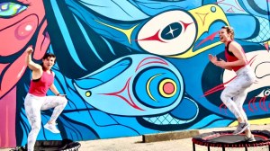 Rebounder HIIT Cardio Workout / Plus Strength is another excellent and inventive rebounder workout from Naomi Joy. I really enjoyed this workout. It is set outdoors in front of a beautiful and colorful mural. This is a cardio + strength circuit workout. There are 5 cardio circuits and 5 strength circuits. You do not need any equipment except your rebounder unless you need to modify. Naomi’s friend Amber is working out with her. Amber shows easier modifications for many of the moves and also uses dumbbells to modify one of the body weight exercises. The exercises are done interval style: each exercise is done for 45 seconds followed by 15 seconds of recovery. The way this workout is structured, with relatively short circuits, seemed to make the time fly by. I was working hard but at the same time, the workout was over before I knew it! I wanted more! Then Naomi gives you a relaxing stretch. Only a few exercises are repeated, too. Two, I think. Squat jumps is one of them, of course! The only other time an exercise is repeated is if it is done on one side of the body, then you repeat it on the other side of the body. There is a timer in the lower right hand corner of the screen, counting down the workout time. There is another timer in the lower left-hand side of the screen, counting down your intervals and recoveries. Naomi and Amber preview the next exercise during the recoveries. This workout is done voice over with great, motivating music.