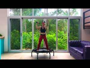 25 Minute Beginners Bounce with Weights is a very deceptive title for this workout! The bouncing is easy and beginner level rebounder work but the weighted arm work can start to burn. Claire of SanFran Fitness says that this workout was requested by viewers. She does build the weighted upper body exercises slowly. I used 2 pound hand weights because that is usually all I can manage with Claire’s weighted rebounder workouts and 2 pounds was perfect for the second half of the workout. But the first half of the workout was so easy, that I should have used heavier dumbbells–3 or 4 pounds. But by the end of the workout, even the two pound hand weights were burning my shoulders. This is a low intensity cardio rebounder workout, but the upper body strength work can get intense, depending on the hand weights you use.