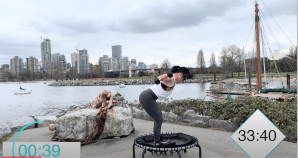 Rebounder Upper Body Strength Circuits // HIIT Sprints is another excellent and fun cardio + strength workout from Naomi Joy done on the rebounder. The focus is the upper body and she does a great job working every muscle group in your upper body nicely. Naomi does this workout outdoors. There is a beautiful body of water behind her and a city behind that with a long beautiful bridge. It is a little overcast so she starts the workout in a windbreaker, but once the workout starts it comes off. She cut the stretch at the end short because it started to rain but she does a great job stretching out your upper body. Your lower body gets some stretching, too, just not as much as she usually gives it. Because she did this away from home, she only brought one set of dumbbells with her but notes that normally she would use heavier dumbbells for some of the exercises. So make sure you are using the appropriate dumbbells for your strength level to get the best workout. I had all of my dumbbells at my disposal so I got an excellent upper body strength workout.