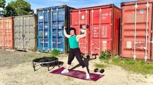 Wow! Another awesome and intense rebounder workout from Naomi Joy. Rebounder Total Body Circuit Workout // Strength + Cardio is a cardio + strength workout. It is done both on the rebounder (the cardio & core work) and on the floor (the strength work). There is no set pattern to this workout. It is one circuit of 17 exercises that you repeat. It ends with 5 minutes of intense core work (at least it was intense for me–my abs were screaming by the end of each interval). It is also a total body strength workout so you are getting it all in this workout: total body strength, cardio, core work plus a long and relaxing stretch. Another major winner! Naomi set this workout at another cool outdoor location. She said that in this workout she is showing you the industrial side of Vancouver. This one looks like it is in some kind of storage place with colorful metal shipping containers behind her.