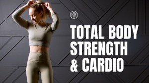 Total Body // Strength & Cardio HIIT Workout is 44:07; 3 minute warm up and 3:30 minute stretch. Equipment: dumbbells and a fitness mat. Heather is using 5 and 10 pound dumbbells. Below the video it says she used 10 and 15 pound dumbbells but that seemed a little unrealistic for some of the exercises (plus in the video it looks like she is using 5 pound dumbbells). Then I checked her Facebook page and she acknowledged it was a typo. The weights listed below are what I used.