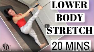 20 Min Lower Body Stretch for Recovery and Flexibility is 22:04 minutes. Equipment: 6 foot dyna/theraband (or yoga strap or towel) and a fitness mat.