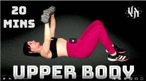 Upper Body Strength Workout with Dumbbells is 25:50 minutes; 30 second intro, 2 minute warm up and 3 minute stretch. Equipment: dumbbells and a fitness mat. Naomi is using 20 and 10 pound dumbbells. The weights listed below are what I used.
