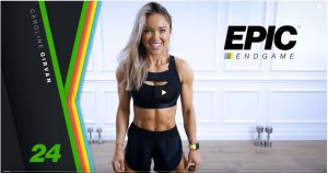 Calculated Dumbbell Full Body Workout is Day 24 in Caroline Girvan‘s EPIC Endgame program. This is tough endurance level workout. For a complex workout, the complexes are shorter than what Caroline usually gives–only 2 minutes–but my muscles were still burning out by the end of the 2 minutes. It’s also very metabolic. You will burn a bunch of calories while working your entire body. I burned 398 calories. For most of the complexes I used the same dumbbell for both exercises, but for Complex 9, I needed vastly different weights for each exercise, so I made sure the second set of dumbbells was at my feet before the complex began so I could swap my weights quickly. Another intense and thorough total body workout!
