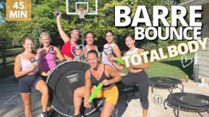 Trampoline Barre Workout | Total Body Sculpt & Tone is 48:07 minutes; one minute intro, 3 minute warm up and 3 minute stretch. Equipment: rebounder, light dumbbells (1-5 pounds) and a booty band/resistance loop. Michelle is using 5 pound hand weights and one pound lace up weights. I used 2 and 3 pound hand weights. I also used a strong booty band for all of the exercises where the band is above the knees and a rubber booty band for any exercise where the band is below the knees.