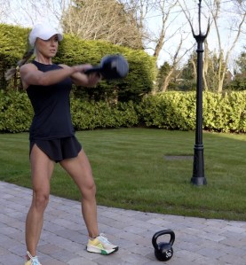 Outdoor Kettlebell Cardio is 13:01 minutes (this time does not include the optional 11:39 minute warm up) with a 1:25 minute stretch. Equipment: kettlebell(s). Caroline is using a 20kg/44 pound and a 10kg/22 pound kettlebell. The kettlebell weights listed below are what I used.