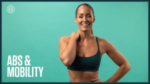 No Equipment Abs Workout + Hip Mobility is 42:44 minutes; 50 second intro, 2:15 minute warm up and 3 minute stretch. Equipment: a fitness mat. This workout is made up of two circuits. An ab circuit followed by a hip mobility circuit. The exercises are done interval style: 40 seconds of work followed by 10 seconds of recovery. There is a timer in the lower right hand corner of the screen counting down your intervals and recoveries. During the recoveries Heather previews the next exercise.
