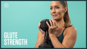 This workout contains 3 circuits; a glute activation circuit and 2 strength circuits. The exercises are done interval style. In the glute activation circuit the exercises are done for 45 seconds followed by 15 seconds of recovery. For the strength circuits the exercises are done for 40 seconds of work followed by 20 seconds of recovery. There is a timer in the lower right hand corner of the screen counting down your intervals and recoveries. During the recoveries Heather previews the next exercise. At the bottom of the screen during the preview, there is a small graphic with a weight recommendation–light, medium or heavy.
