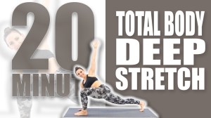 Total Body Deep Stretch is 22:03 minutes. Equipment: fitness mat. There is a timer in the lower right hand corner of the screen counting down total workout time.