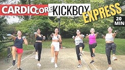 20 Min Low Impact Cardio Core Kickbox | Intense Cardio HIIT is 28:49 minutes; 45 second intro, 3 minute warm up and 3:30 minute stretch. Equipment: light hand weights, lace ups or weighted gloves, and fitness mat. Michelle and crew are using one pound weighted lace ups. I wore 2 pound weighted gloves