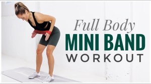 Full Body Mini Resistance Band Workout is 25:41 minutes; no warm up and 1:20 minute stretch. Equipment: resistance loop/booty band and a fitness mat. The workout starts with the band around thighs just above knees.