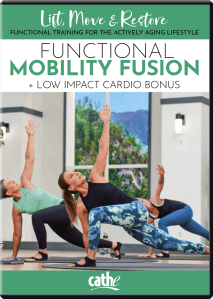 Functional Mobility Fusion is 42:28 minutes; 14 minute warm up (#1-11) and a 2:30 minute cool down. Equipment: fitness mat.