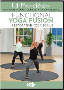 Functional Yoga Fusion contains two workouts. The main workout is a 41 minute yoga flow and the 23 minute bonus is “restorative” yoga which is similar to yin yoga. In yin yoga you hold poses for a very long time and it can get pretty uncomfortable. Restorative yoga also holds poses for a long time but uses a bolster to make it more comfortable so you can relax into the stretches. Cathe uses yoga blocks in place of a bolster. The first time I did these workouts I did the premix that combines them. You do the main workout, skipping only the final resting pose and finish with the restorative yoga bonus which has its own final resting pose. It makes for a lovely hour long session of flexibility and mobility. There are no advanced poses and Cathe shows a modification for anything that may cause an issue. I did not break a sweat doing this workout but found it very worthwhile for a recovery day. I got some deep stretches (both dynamic and static) and some mobility. You start with the more active sun salutations, move into standing poses then she takes you to the mat. A very feel good workout.